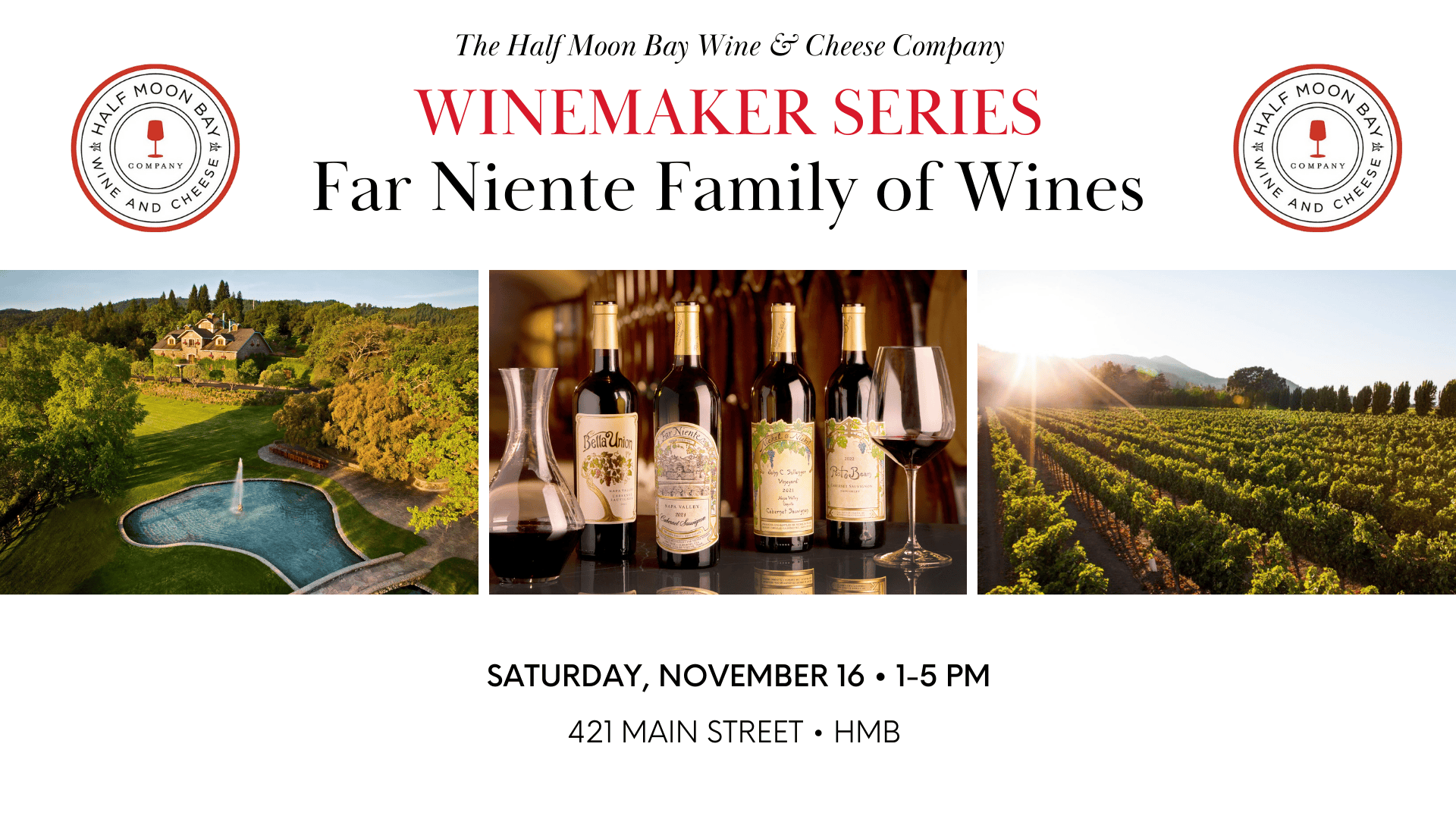 Explore a diverse selection of wines from Far Niente's family of wineries and vineyards during their tasting event at our wine bar on Saturday, November 16, between 1-5 p.m. hosted by Terri Bancroft of Far Niente Family of Wines.