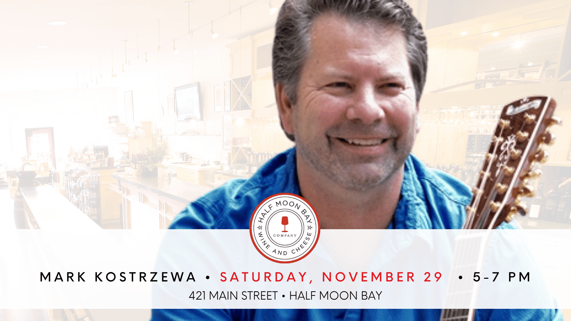 Close out Thanksgiving week with the warm, coastal sounds of Mark Kostrzewa on Saturday, November 29 from 5–7 pm.